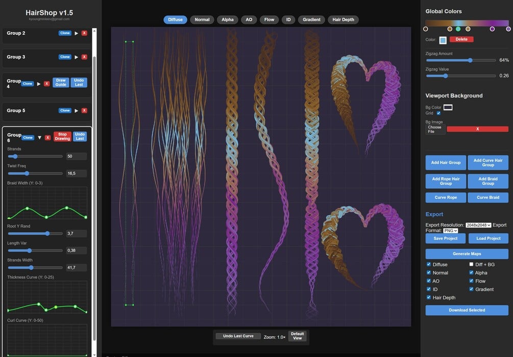 Unlike typical texture generators, this tool provides complete artistic control, real-time preview features, procedural styling, curve-based grooming, and full map exporting — all inside a lightweight and intuitive interface.